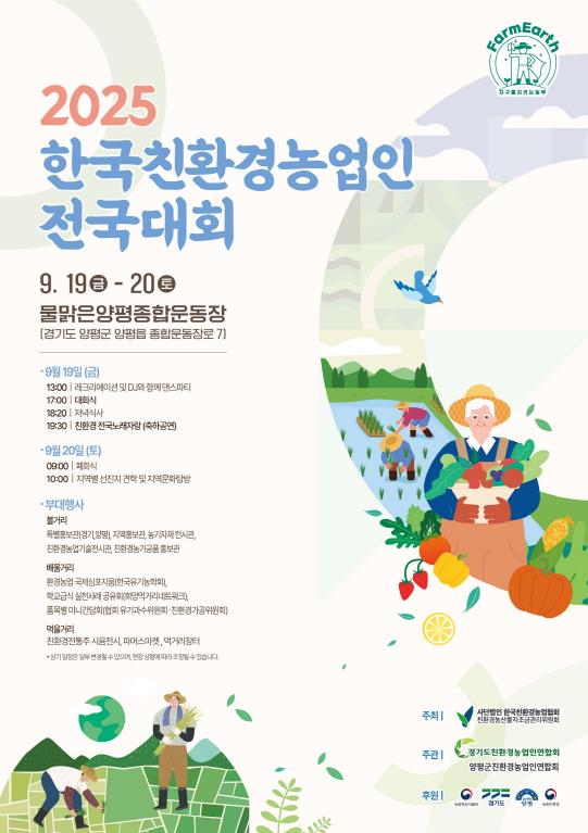 [파이낸셜경제=김영란 기자] 경기도는 오는 19일부터 20일까지 양평 물맑은양평종합운동장에서 ‘2025 한국친환경농업인 전국대회’를 개최한다고 밝혔다. 전국 10개 시도 친환경농업인 1만여 명이 참여하는 대규모 행사로, 친환경 실천 결의와 기후위기 대응 방안을 공유하는 교류의 장이 될 전망이다.