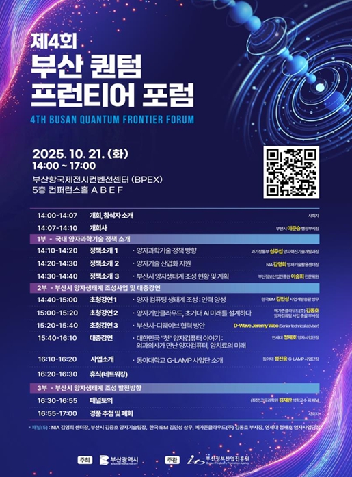 [파이낸셜경제=박영진 기자] 부산시는 오는 10월 21일 오후 2시 부산항국제전시컨벤션센터 컨퍼런스홀에서 '제4회 부산시 퀀텀 프런티어 포럼'을 개최한다고 밝혔다.