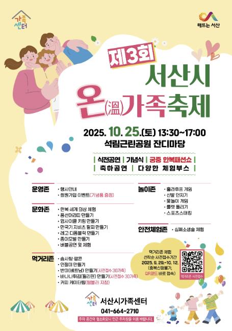 [파이낸셜경제=김영란 기자] 충남 서산시는 오는 10월 25일 석림근린공원 잔디마당 일원에서 제3회 온(溫)가족 축제를 개최한다고 밝혔다.