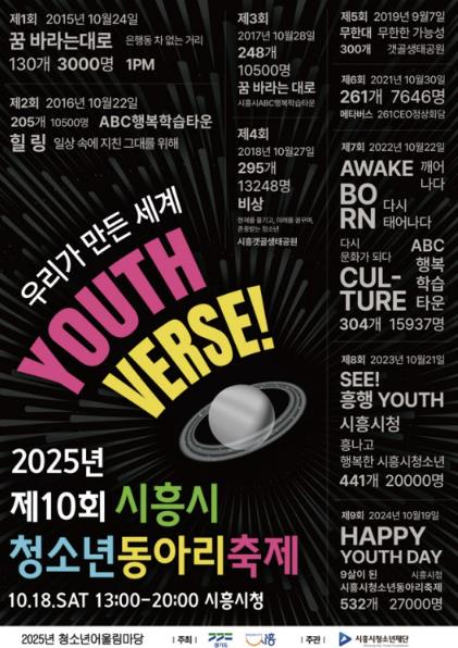 [파이낸셜경제=김영란 기자] 10주년을 맞은 시흥시청소년동아리축제가 오는 10월 18일 시흥시청에서 개최된다. ‘우리가 만든 세계: YOUTHVERSE’를 주제로 열리는 이번 축제는 지난 10년간의 활동을 돌아보는 동시에 앞으로 축제가 나아가야 할 길을 내다보는 전환점이 될 것으로 보인다.