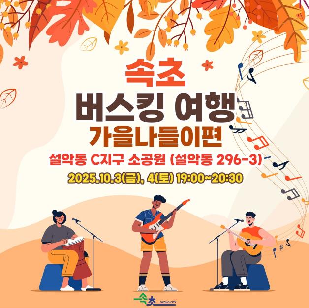 속초시 관계자는 “이번 연휴를 맞아 설악동을 찾는 시민과 관광객에게 다채로운 즐길거리를 선사하고자 버스킹 행사를 마련했으며, 자연 속에서 울려 퍼지는 음악과 함께 설악동의 매력을 만끽하셨으면 좋겠다”고 전했다.