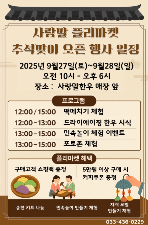 특히, 플리마켓 오픈 기념으로 민속놀이, 떡메치기 체험과 함께 다양한 이벤트를 진행할 예정이다.