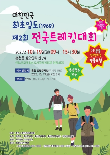 [파이낸셜경제=조성환 기자] 홍천군은 ‘대한민국 최초임도(1968) 제2회 전국트래킹대회’가 10월 19일 오전 9시 홍천군 상오안리 며느리 고개 일원에서 개최된다고 밝혔다.