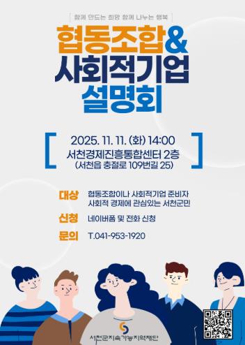 [파이낸셜경제=김영란 기자] (재)서천군지속가능지역재단은 오는 10월 20일 오후 2시, 서천경제진흥통합센터에서 ‘협동조합·사회적기업 설명회’를 연다.
