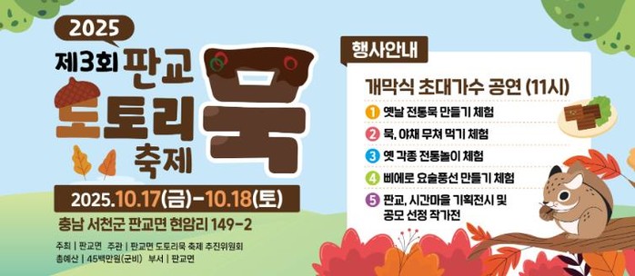 백찬기 축제추진위원장은 “올해로 3회째를 맞은 판교 도토리묵 축제를 더욱 풍성하고 내실 있게 준비했다”며 “맛 좋고 건강에도 좋은 도토리묵을 즐기고, 다양한 프로그램을 함께 체험해 보시길 바란다”고 말했다.