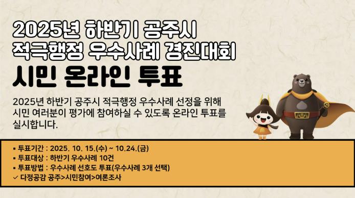 시민 투표는 다정공감 공주 누리집의 ‘시민참여-여론조사’ 메뉴에서 ‘2025년 하반기 공주시 적극행정 우수사례 경진대회 시민 온라인 투표’ 항목을 선택해 참여할 수 있다.