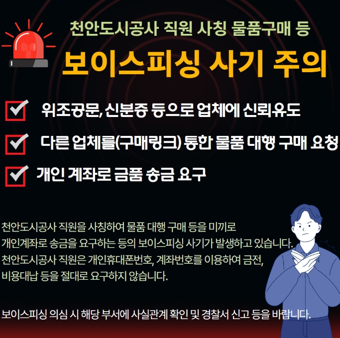 [파이낸셜경제=김영란 기자] 천안도시공사가 최근 공사 직원을 사칭한 보이스피싱 사례가 발생함에 따라 피해 예방을 위한 주의를 당부했다.