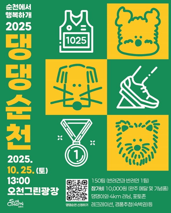 [파이낸셜경제=김예빈 기자] 순천시는 오는 25일 오후 1시 오천그린광장 일원에서 반려견과 반려인이 함께 달리는 힐링 러닝축제 ‘2025 댕댕순천’을 개최한다.