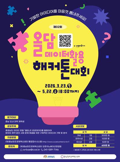 [파이낸셜경제=김영란 기자] 충남창조경제혁신센터는 충남도내 대학 재학생을 대상으로 공공데이터를 활용한 창의적 아이디어 발굴을 위한 '제2회 올담 데이터 활용 해커톤' 참가자를 오는 5월 22일까지 모집한다고 밝혔다.