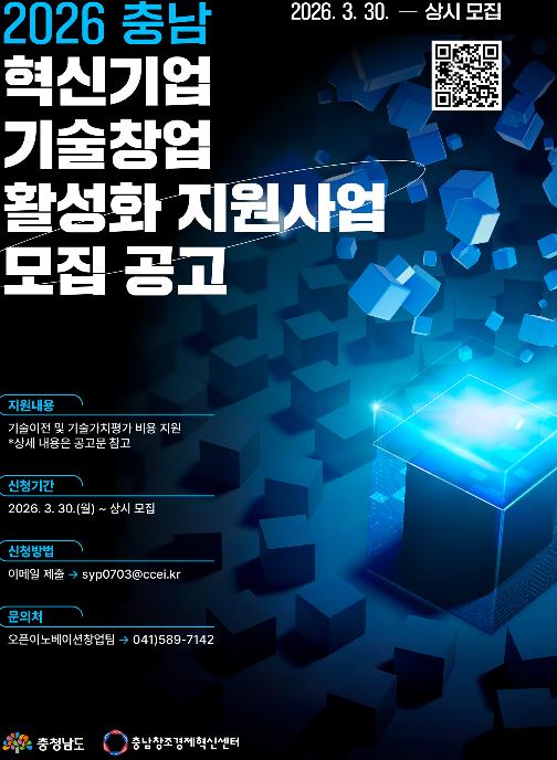 [파이낸셜경제=김영란 기자] 충남창조경제혁신센터가 지역 창업기업의 기술 경쟁력을 높이고 성공적인 사업화를 돕기 위해 ‘2026년 충남 혁신기업 기술창업 활성화 지원사업’을 시행하고 참여 기업을 모집한다고 밝혔다.