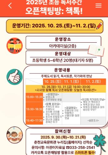 ▲ 춘천교육문화관, 초등 독서주간 ‘오픈책팅방: 책톡!’운영 |