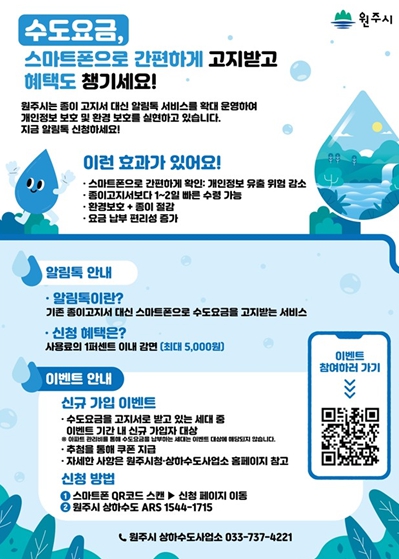 [파이낸셜경제=조성환 기자] 원주시상하수도사업소는 ‘수도요금 알림톡 서비스’ 확대를 위해 10월 1일부터 12월 7일까지 신규 가입 이벤트를 진행한다.