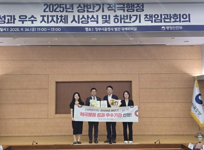 [파이낸셜경제=조성환 기자] 강원특별자치도가 행정안전부 주관 ‘2025년 상반기 지방자치단체 적극행정 성과 점검’에서 전국 광역자치단체 중 유일하게 우수기관으로 선정돼 행정안전부 장관 표창을 수상했다.