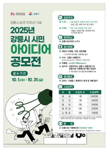 [파이낸셜경제=조성환 기자] 강릉시는 강릉시 승격 70주년을 맞아 시민의 창의적이고 혁신적인 의견을 시정에 반영하기 위해 ‘2025년 강릉시 시민 아이디어 공모전’을 10월 1일부터 10월 31일까지 31일간 개최한다.